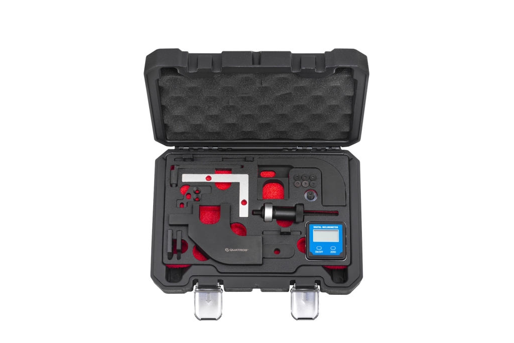 Zestaw zawiera cyfrowy kątomierz (inklinometr) zalecany przez PSA do kontroli zużycia łańcucha oraz poprawnego ustawienia wałka ssącego zmiennych faz rozrządu.